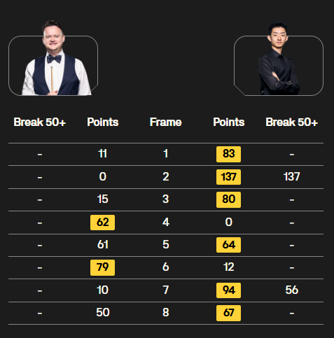 首局,墨菲失误不断,吴宜泽先下一城。第2局,墨菲开杆就漏球,吴宜泽轰出137分破百清台。第3局,乱局,吴宜泽多次上手,3-0领先。第4局,运气球帮忙,墨菲通过斯诺克获机会,扳回一城。