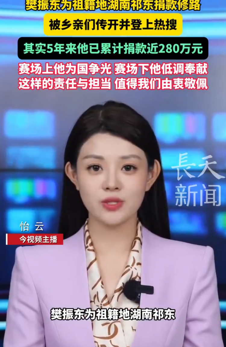 根据《长天新闻》的报道,樊振东为祖籍地湖南祁东捐款修路被乡亲们传开并登上热搜,最近五年樊振东已经为家乡祁东捐款近280万元,而且还不是樊振东方面传出的消息,是乡亲们得知消息后在社媒上感谢樊振东这才让媒体洞悉小胖的仁心、善举。