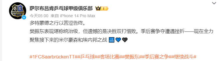 萨尔布吕肯俱乐部官方盛赞樊振东:多特蒙德之行苦涩告终,樊振东表现堪称统治级,但遗憾决胜局双打惜败。