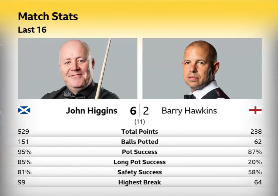 凌晨时段,巫师希金斯对阵霍金斯。这是希金斯连续第32次参加大师赛,大师赛的出勤王。