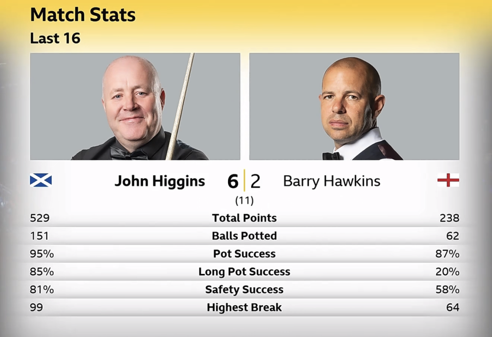6-2定律!希金斯战胜霍金斯,大师赛8强中国最多4席,看丁俊晖了