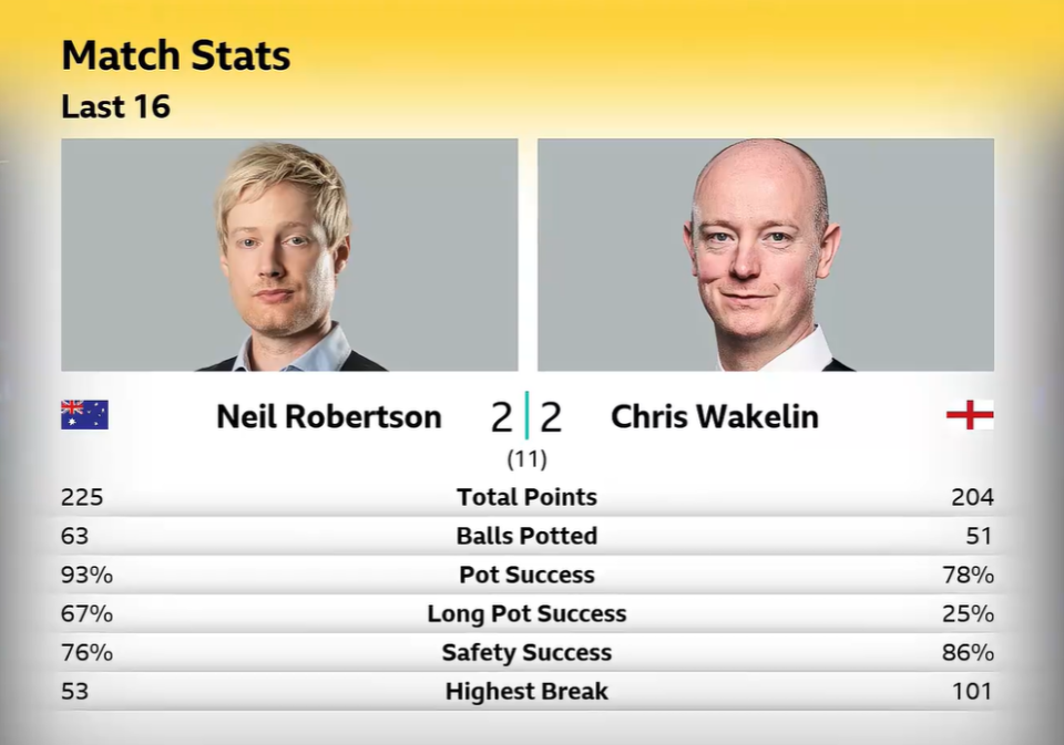 罗伯逊拿下首局后,第2局,韦克林抓住罗伯逊失误,一杆65分完成超分。罗伯逊一度罚得5分、挽救超分局面,但还是没能完成逆转。第3局,罗伯逊虽然有简单球失误,但两次上手完成超分,2-1。 第4局,韦克林一杆破百,双方战成2平。