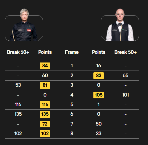 短休后,第5局,罗伯逊抓住韦克林失误,回敬一杆破百。第6局,罗伯逊长台上手,再轰一杆破百。第7局,双方各有失误,韦克林简单球失误,错失逆转制胜机会。罗伯逊5-2到赛点。这是又要奔着6-2去了?