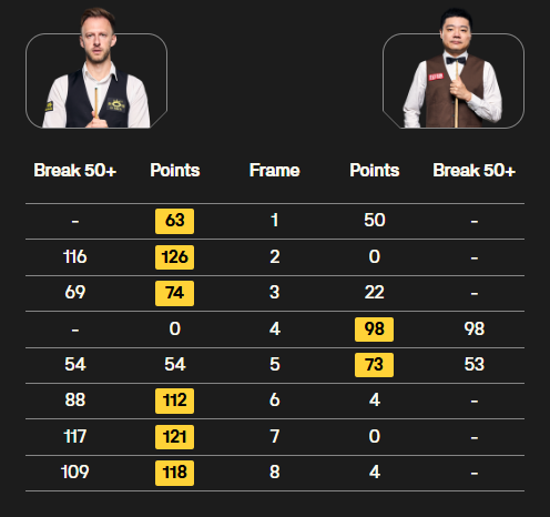 首局,丁俊晖多次错失制胜机会,被小特单局逆转。第2局,小特拼进红球中袋上手,轰出一杆破百。第3局,又是准进红球中袋上手,小特一杆69分完成超分,3-0。第4局,丁俊晖抓住小特失误,一杆98分制胜,扳回一局,1-3。