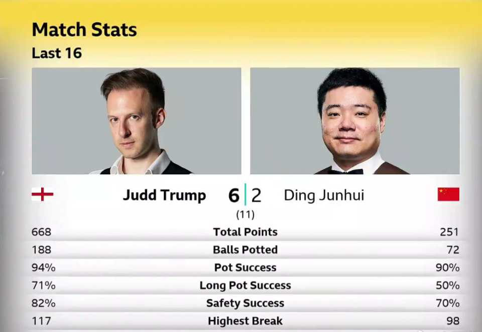 本场比赛,丁俊晖打得不算差,进球成功率在90%,但面对状态出色的特鲁姆普,攻防两端被全面压制,缺乏打开局面的手段。