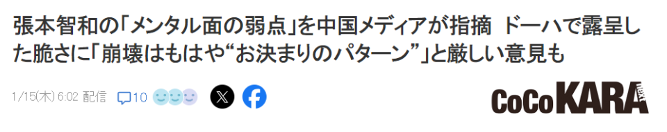 该媒体还回顾了2024年巴黎奥运会等过往赛事,指出张本智和不乏多次距胜利仅一步之遥却功亏一篑的经历,直言“屡屡手握赛点却被逆转——张本智和的崩盘,早已成为比赛的常规戏码”。报道同时将他与妹妹张本美和对比,称“与身处逆境仍能冷静实现逆转的妹妹张本美和相比,两人抗压能力的差距十分显著”。