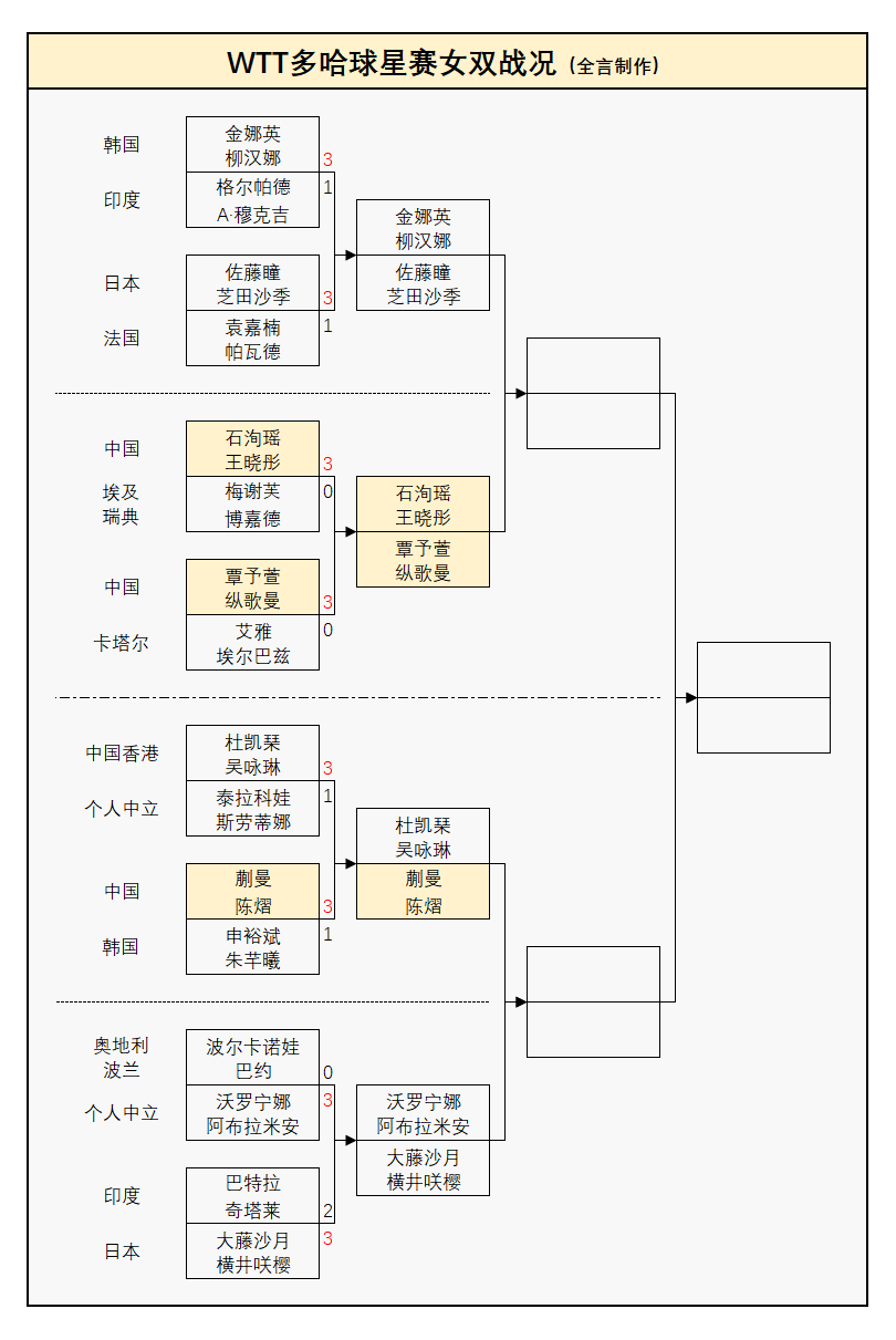 女双方面,国乒同样遇到冲击,其中蒯曼/覃予萱与韩国名将组合申裕斌/朱芊曦之战赢得比较惊险,其余场次都是强势大获全胜,战况如下:
