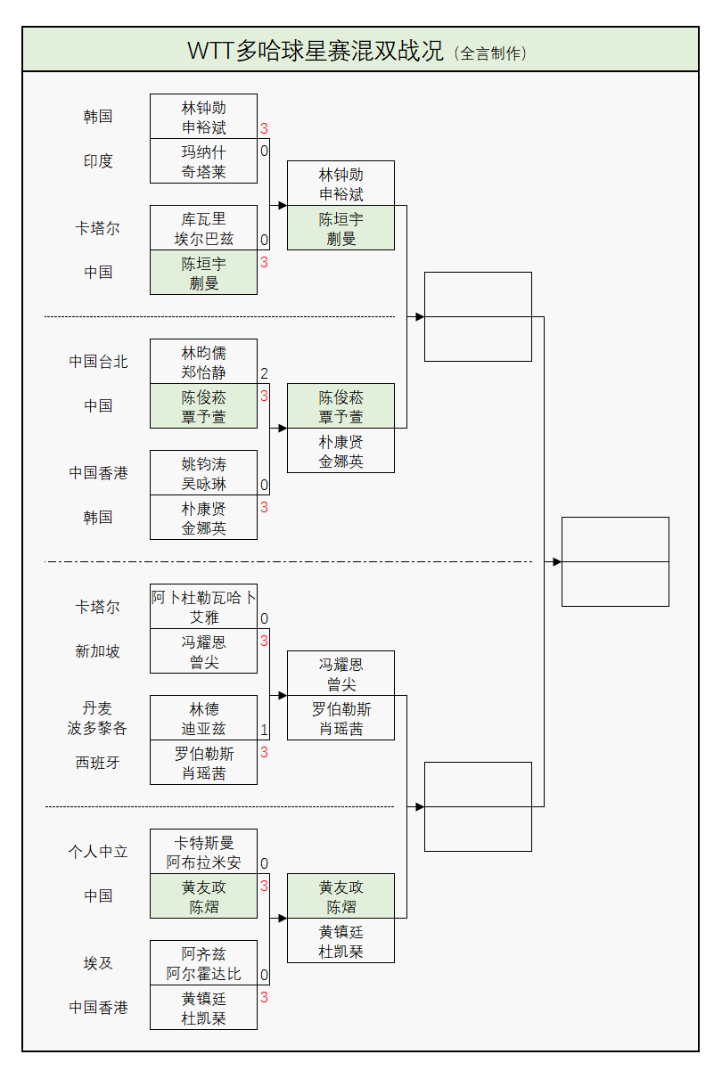 陈垣宇/蒯曼3-0库瓦里/埃尔巴兹(卡塔尔):11-2、11-6、11-6;