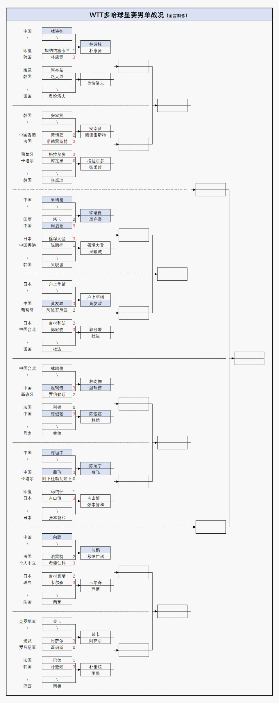 男单中国队多次遭遇冲击但没有在正赛首轮输球,其中周启豪、黄友政、温瑞博都是在先丢2局的情况下连扳3局逆转,陈俊菘、薛飞虽然大比分零封对手,但小分也有出现险情: