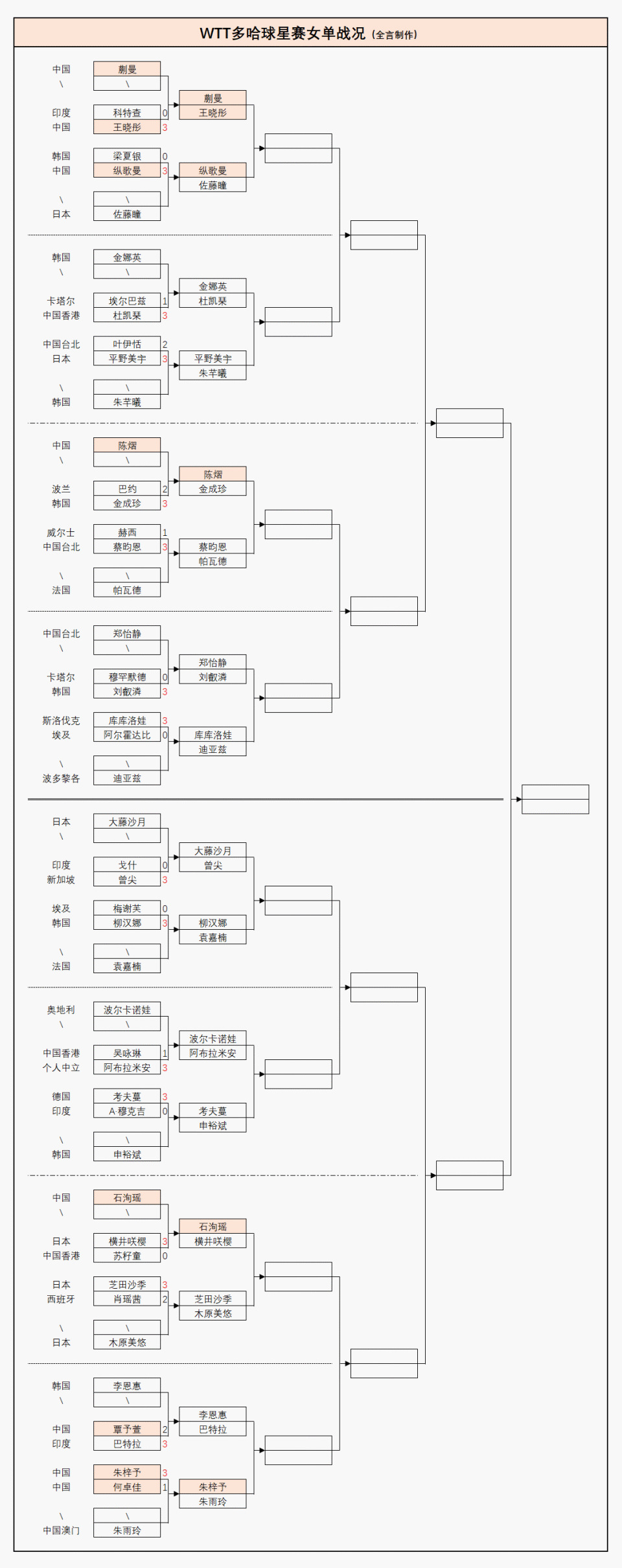 女单国乒爆发了目前唯一的一场内战,结果名气更大的何卓佳领先后被朱梓予逆转,此外覃予萱在外战中被印度选手巴特拉淘汰,王晓彤、纵歌曼成功晋级,详细战况如下: