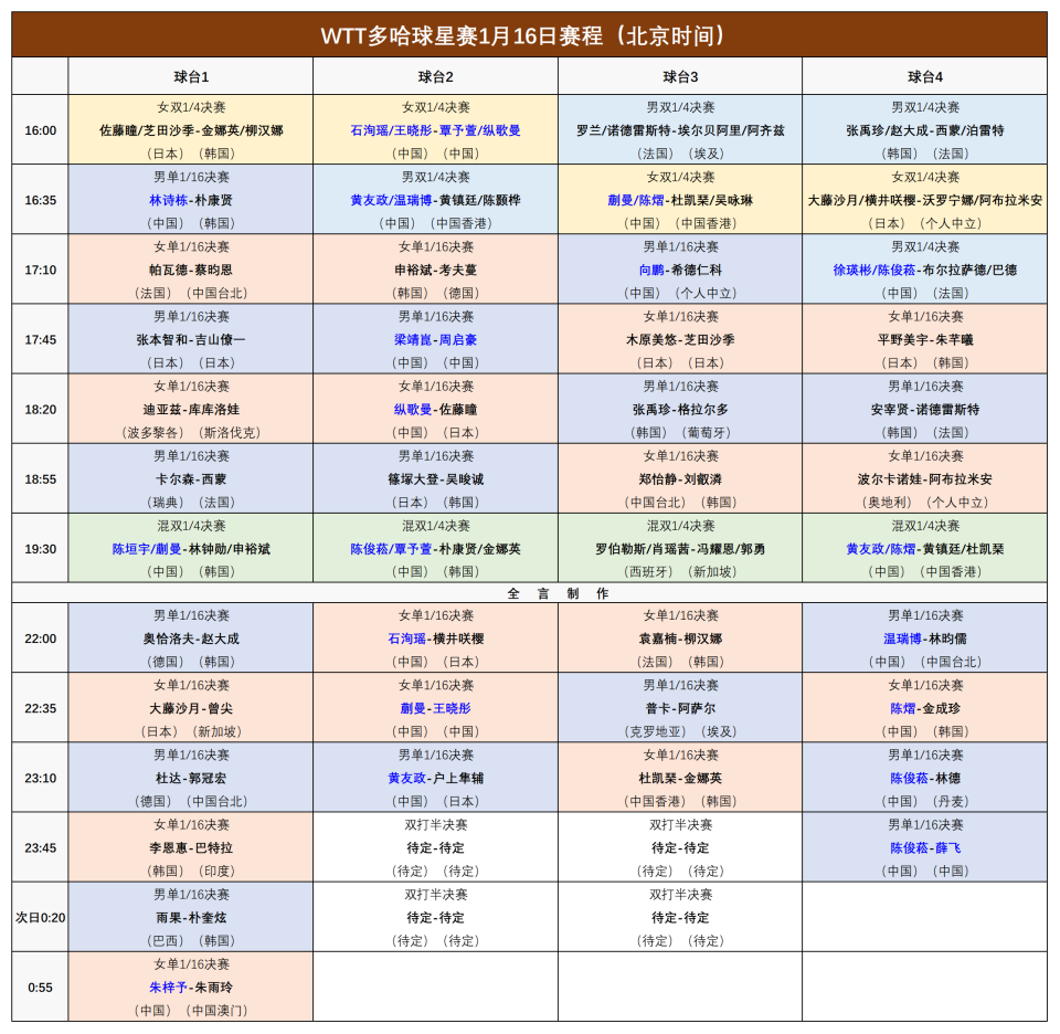 WTT球星赛:5位世界冠军遭败绩!国乒主力输球,1月16日赛程公布
