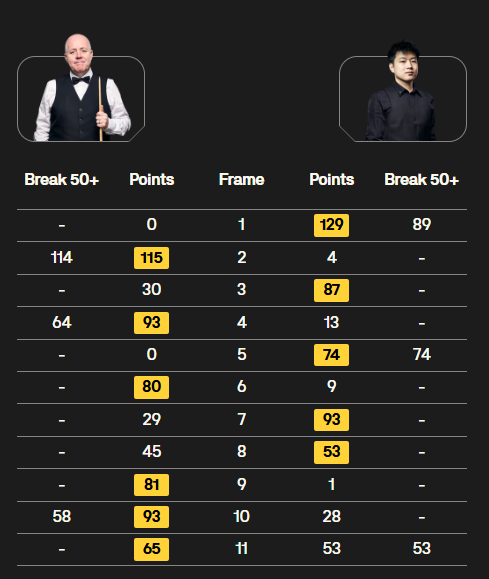 第9局,希金斯走位频出问题,但多次上手胜出。第10局,关键时刻,运气球帮忙,希金斯再救赛点,将比赛拖入决胜局。