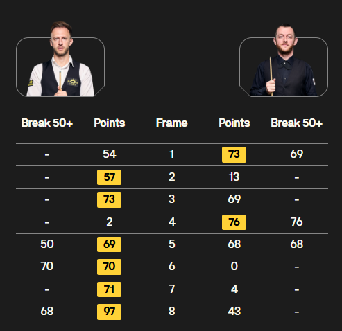 第8局,艾伦翻袋上手后,随即出现失误。小特单杆68分完成超分,但打丢锁定胜利的红球,强行加戏。艾伦连续通过斯诺克,挽救超分局面,但终究功亏一篑。