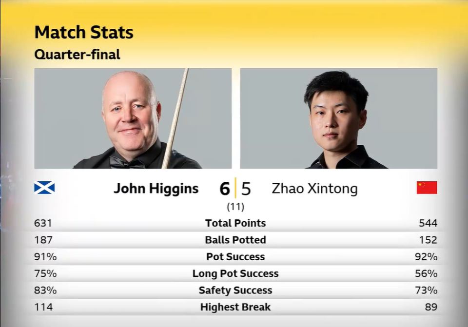 5-3领先决胜局遭逆转!斯诺克大师赛:赵心童憾负希金斯无缘四强