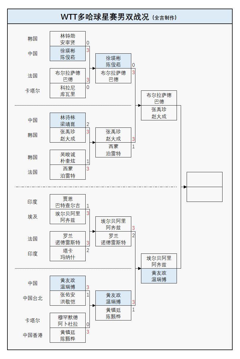 2026年1月16日,乒乓球WTT多哈球星赛结束男双1/4决赛,国乒组合黄友政/温瑞博爆冷淘汰世界排名第1的中国香港配对黄镇廷/陈颢桦,但徐瑛彬/陈俊菘0-3不敌法国选手,中国队参加该项目的3位世界冠军(林诗栋、梁靖崑、徐瑛彬)由此而均遭败绩,韩国、法国、埃及各拿到1张半决赛门票,详细战况请看下文。