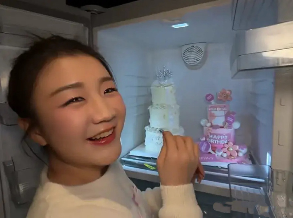 她打开冰箱门,我们看到了很精致的蛋糕,非常梦幻的多层蛋糕。
