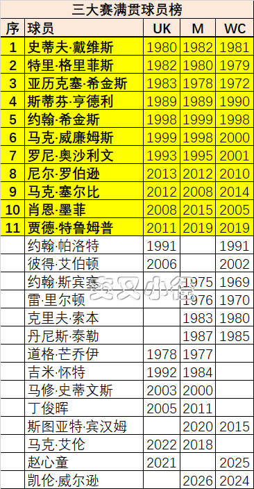 4. 单赛季包揽英锦赛和大师赛的球员,除第1项3人外,另包括,约翰-希金斯、马克-塞尔比和罗尼-奥沙利文,共6人。