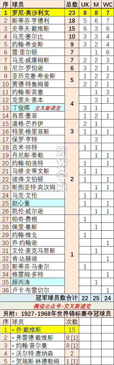 奥沙利文23冠居首。36人上榜,中国球员3人。