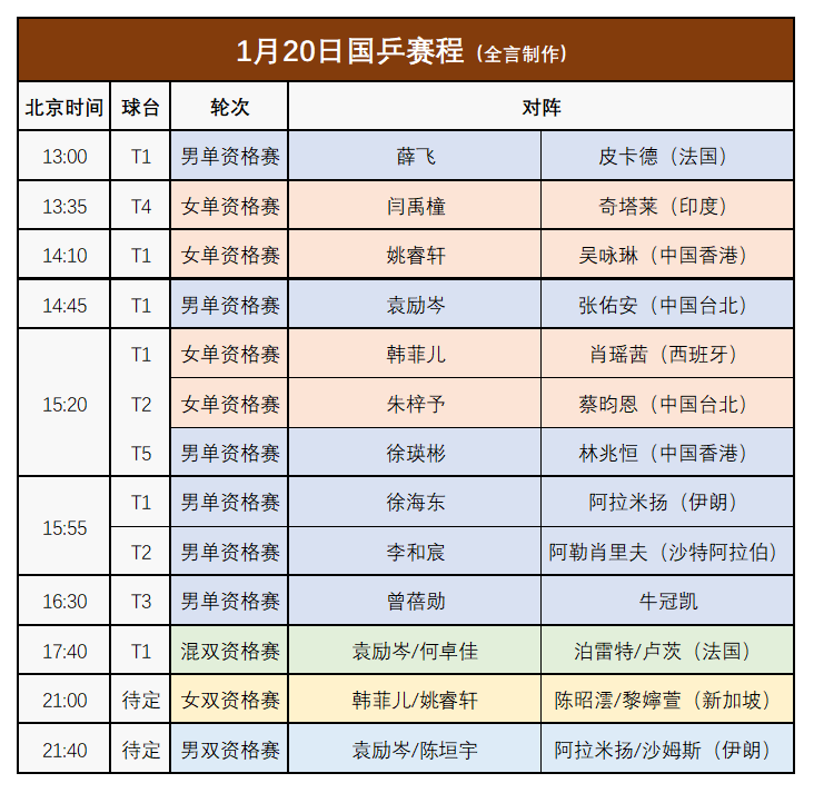 根据安排,北京时间1月20日国乒暂时迎来13场比赛,除曾蓓勋与牛冠凯之间是内战以外,其余都是阻击外协会运动员,具体赛程为: