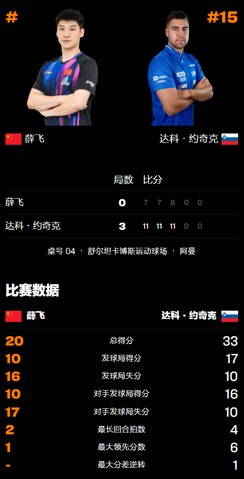 2026年1月21日晚,乒乓球WTT马斯喀特常规赛继续进行,国乒直拍名将、有“张本智和克星”美名的薛飞遭遇惨败,在男单正赛首轮0-3不敌斯洛文尼亚选手达科,由此而止步32强被淘汰,这也是他近一年来的第13次单打输外协会运动员,详细战况请看下文。