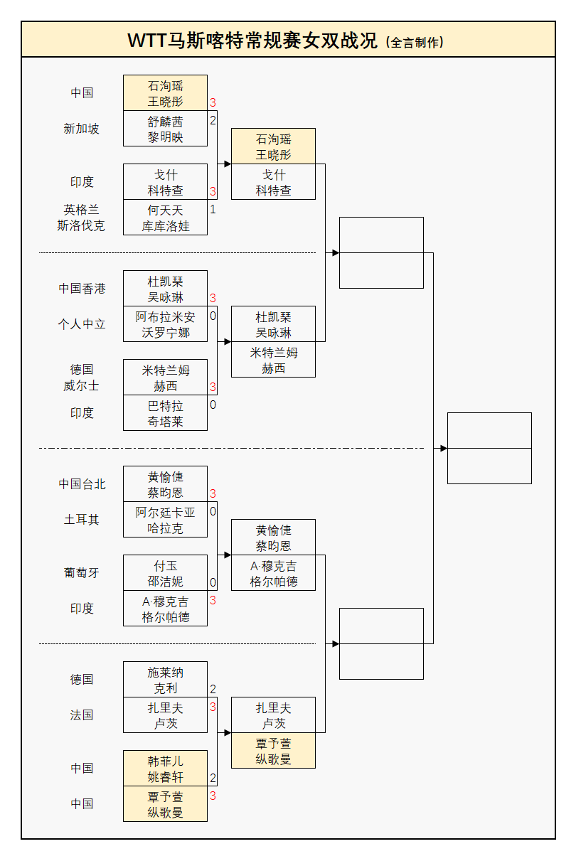 女双中国队选手表现稳定,暂时只有韩菲儿/姚睿轩输内战,石洵瑶/王晓彤、覃予萱/纵歌曼外战全胜——以下为双打项目的正赛进展: