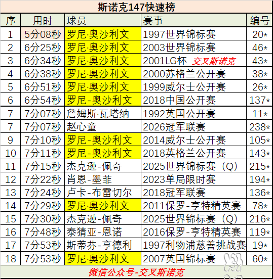 赵心童这杆147完成得非常快,耗时7分07秒。目前,7分钟内完成147的,仅火箭奥沙利文一人(6杆)。随后,就是前亚洲球王詹姆斯·瓦塔纳和赵心童了,两人完成最快147的时间几乎一样。而在中国球员中,之前最快147是丁俊晖,9分27秒,现在赵心童是大幅提速。