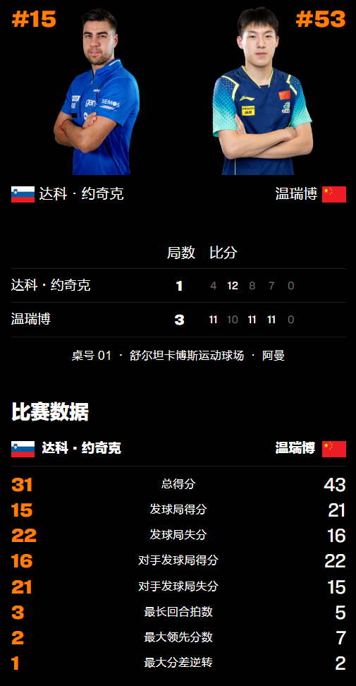 斯洛文尼亚选手达科这次发挥神勇,前后打败两位国乒选手薛飞、林诗栋(头号种子),虽然此前温瑞博3-0赢过达科,但当时每一局都是2分险胜,这次相遇依旧面临严峻考验。