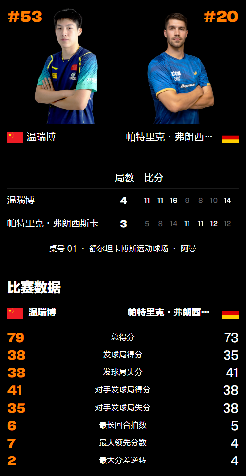 第七局温瑞博上来就反手拧拉强势变线得分,紧接着落后反击9-6领先但很快连丢4分再次被逆转并被弗朗西斯卡拿到赛点,紧接着9-10连得2分11-10反超后再次错失赛点,12-11领先同样没有拿下,12-12后稳住阵脚连得2分,最终以14-12结束战斗成为最后的赢家。