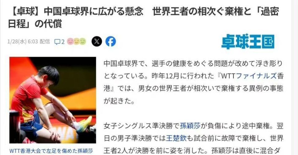 日媒对此进行点评,从总决赛王楚钦、孙颖莎因伤退出开始,到林诗栋、王曼昱受到伤病困扰,最后梁靖崑连续放弃两站重要赛事,指出这是一个不容忽视的问题,跟世界乒联不合理安排有直接关系,近些年的赛事太过密集,包括最新世界排名规则的修改,也加重了高积分选手的负担。