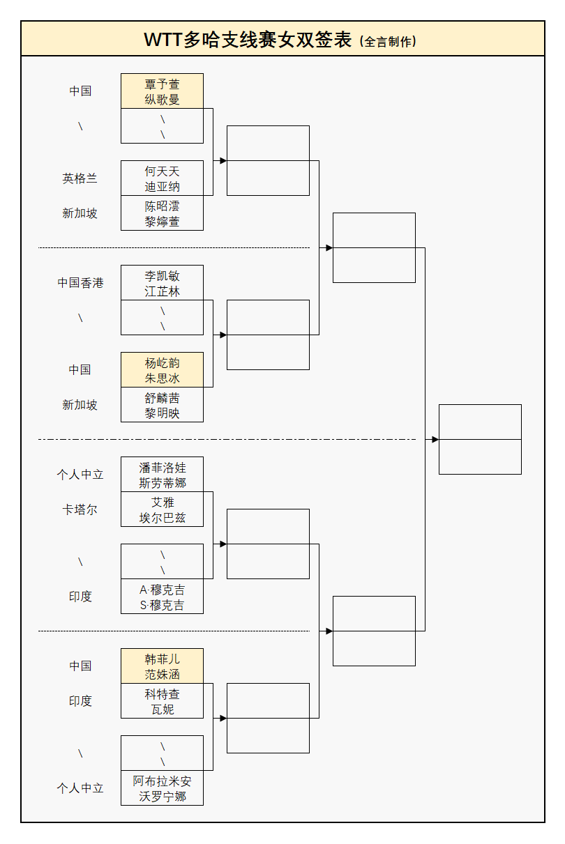 双打方面,国乒在每个项目中都是2对组合位列上半区、1对选手被安排在下半区,其中黄友政/温瑞博、覃予萱/纵歌曼、陈俊菘/覃予萱成为头号种子,此外混双首轮也要打1场内战——以下为5项正赛的完整抽签结果: