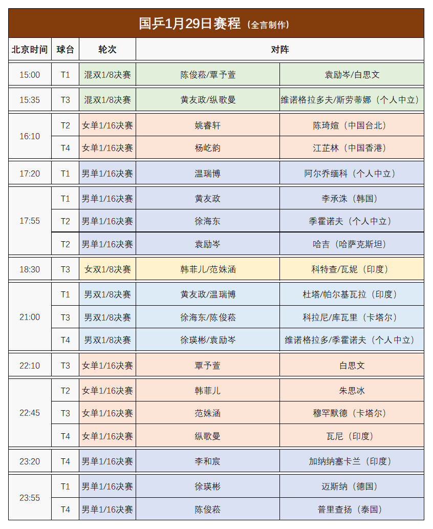 根据安排,1月29日上半场国乒将迎来1场内战与8场外战,赛程如下: