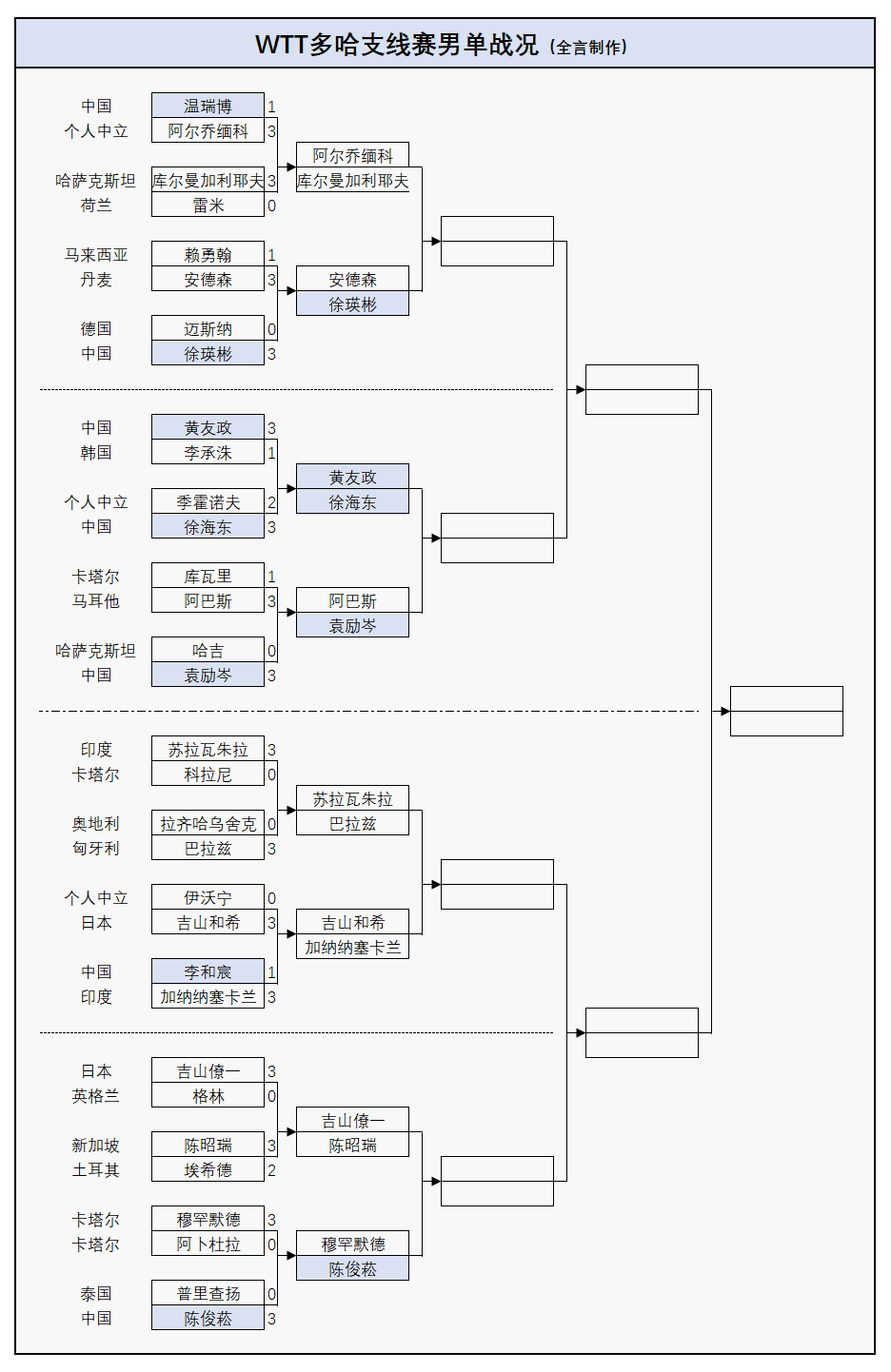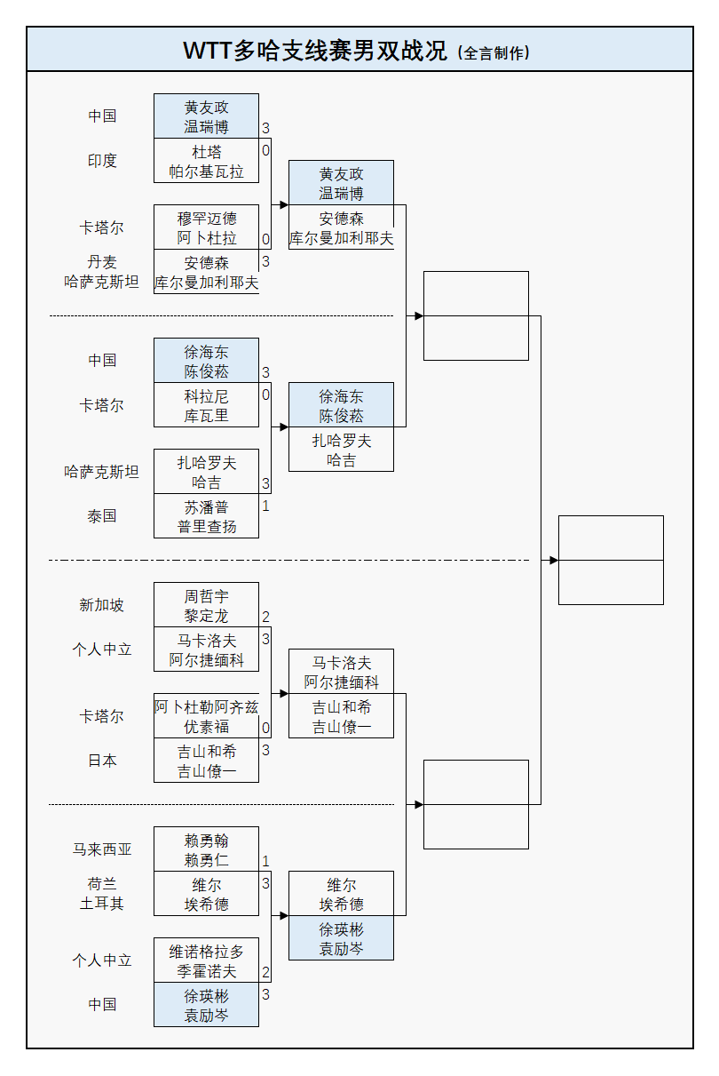 男双:黄友政/温瑞博3-0杜塔/帕尔基瓦拉(印度)、徐海东/陈俊菘3-0科拉尼/库瓦里(卡塔尔)、徐瑛彬/袁励岑3-2维诺格拉多/季霍诺夫(个人中立);