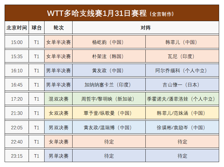 WTT支线赛:国乒提前夺2冠失1金!1月31日赛程公布,诞生5项冠军
