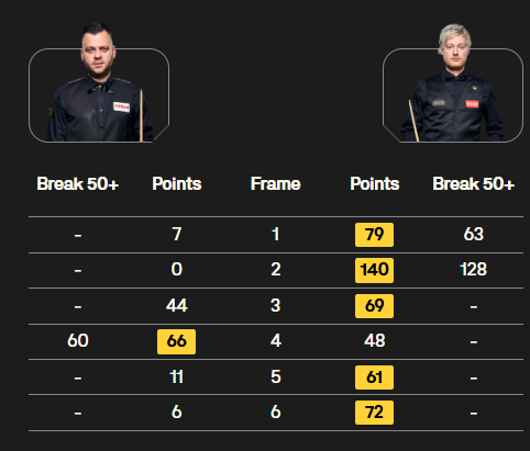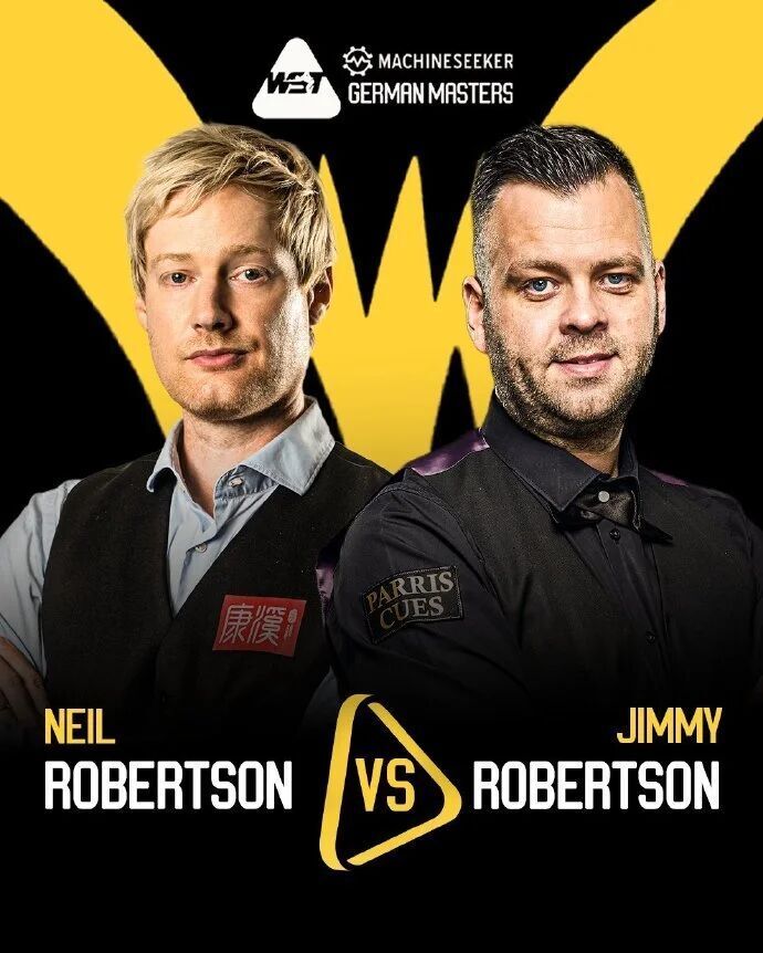 同时段另一场比赛,“两萝卜互啃”,尼尔·罗伯逊打出一杆破百,5-1大胜吉米·罗伯逊。
