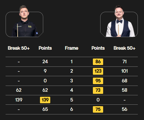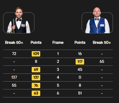 同时段,另一场比赛,机长卡特打出一杆破百和两杆50+,同样是5-1大胜老将宾汉姆。