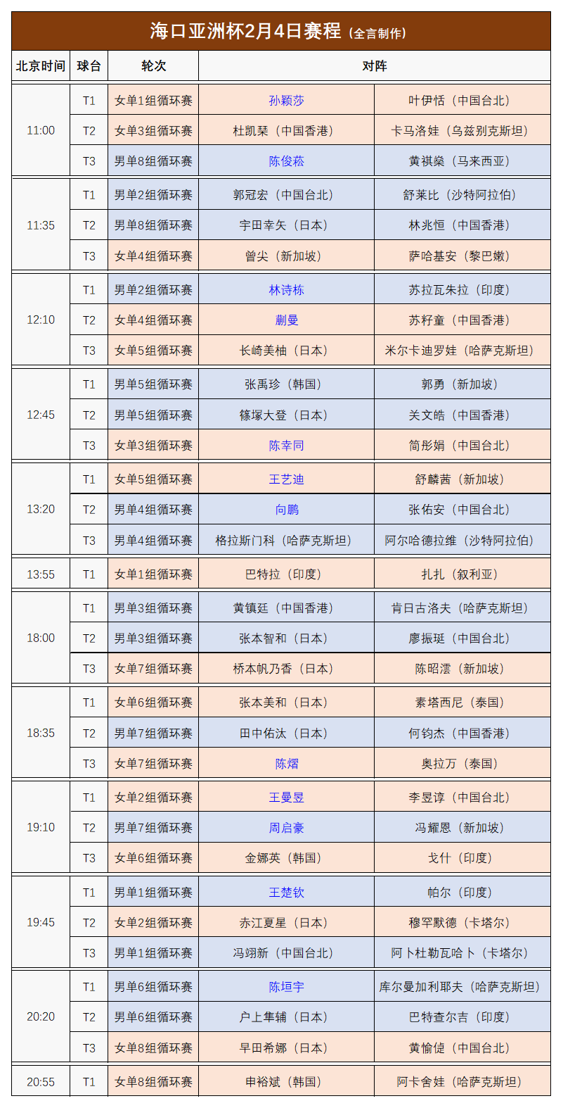 乒乓亚洲杯今天开打!2月4日赛程公布,王楚钦、孙颖莎新年首秀