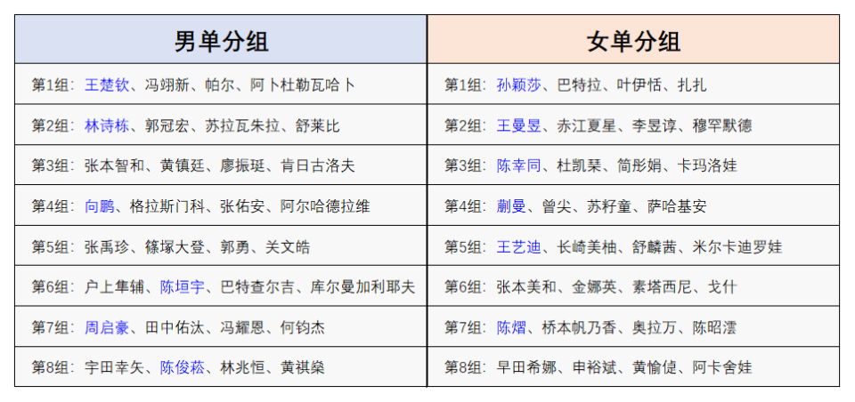 至于王楚钦、林诗栋、向鹏、孙颖莎、陈幸同、蒯曼的对手不是很强,但也有巴特拉等实力不俗的名将,也要做好被冲击的准备,以下为男女单打的详细签表: