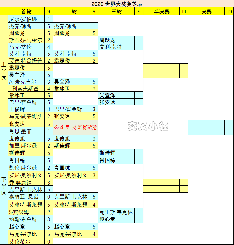 另外,中国球员如果想要拿到5张门票,得把的哥加里·威尔逊给挤下去,如上半区,周跃龙进半决赛、张安达进决赛,下半区斯佳辉或赵心童进决赛。不过这个得牺牲吴宜泽,吴宜泽可不答应。