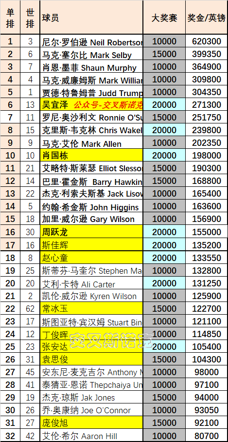 由于火箭奥沙利文放弃参加球员锦标赛,因此最终拿到球员锦标赛参赛资格的,是世界大奖赛结束后单赛季排名前17位球员。火老师也真是不差钱,球员锦标赛保底奖金15000英镑。当然钱不钱是一回事,现在火箭更重要的是多参加高强度的比赛。