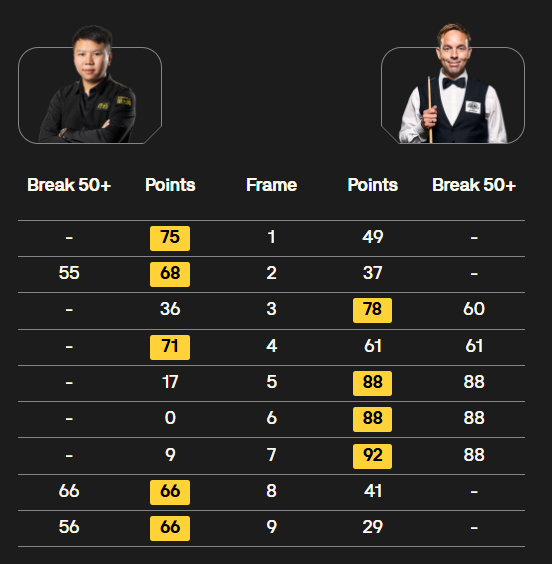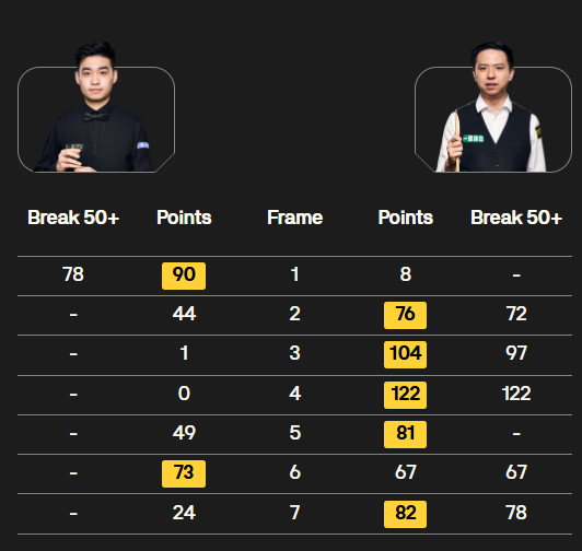 吴宜泽和张安达的比赛,首局,吴宜泽一杆瞎打,张安达打出单杆97分。第2局,张安达错失制胜机会,吴宜泽单局逆转,扳平比分。随后两局,张安达抓住吴宜泽失误,连续打出两杆70+,3-1领先。