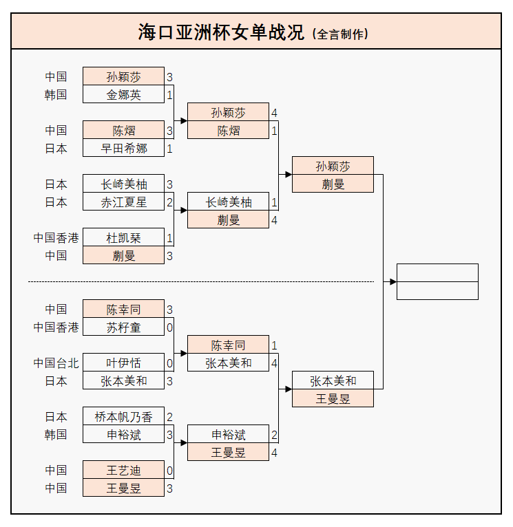 本次比赛国乒女单喜忧参半,其中外战遭遇3场败绩,全部都是被日本选手突破,包括小组赛王艺迪1-3输长崎美柚、陈熠1-3输桥本帆乃香,以及1/4决赛陈幸同1-4张本美和。最终王艺迪、陈熠被队友淘汰,中国队剩余3位选手入围该项目的4强,外协会仅剩张本美和1人,晋级形势如下: