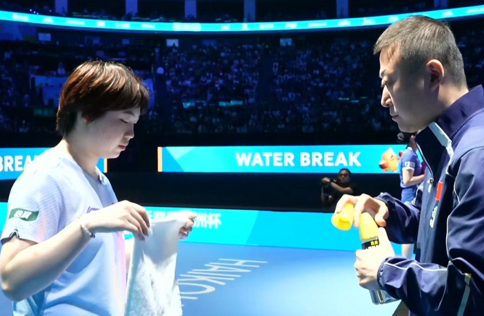 比赛开始后,张本美和开局不利连丢2分,随后增加回球旋转压制蒯曼的速度追至3-3平,紧接着再得2分反超对手,后半段不断领先被追至9-9平,关键时刻蒯曼被对方擦网得分拿到局点,紧接着再输1球以9-11惜败先丢一城。