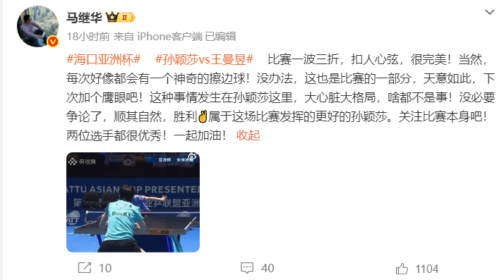 马继华老师也谈到这个擦边球,没办法,这是比赛的一部分,如果下次亚洲杯能有鹰眼就能避免。孙颖莎大心脏大格局,没必要继续争论,胜利已经属于发挥更好的孙颖莎,两位选手都很优秀。