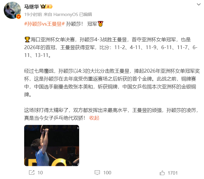 北京时间2月9日,亚洲杯金牌选手孙颖莎发布了长文,回顾2026年海口亚洲杯之旅,圆满收官。王曼昱的坚韧和实力一直是我非常尊敬的,我们彼此激励,共同进步,这是一种超越胜负的美好。