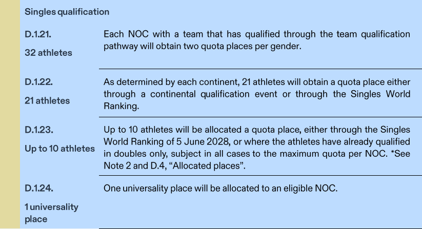 4对:混双资格赛(2028年3月15-5月7日)前四名,限此前未获资格的组合参赛,每个奥委会限1对