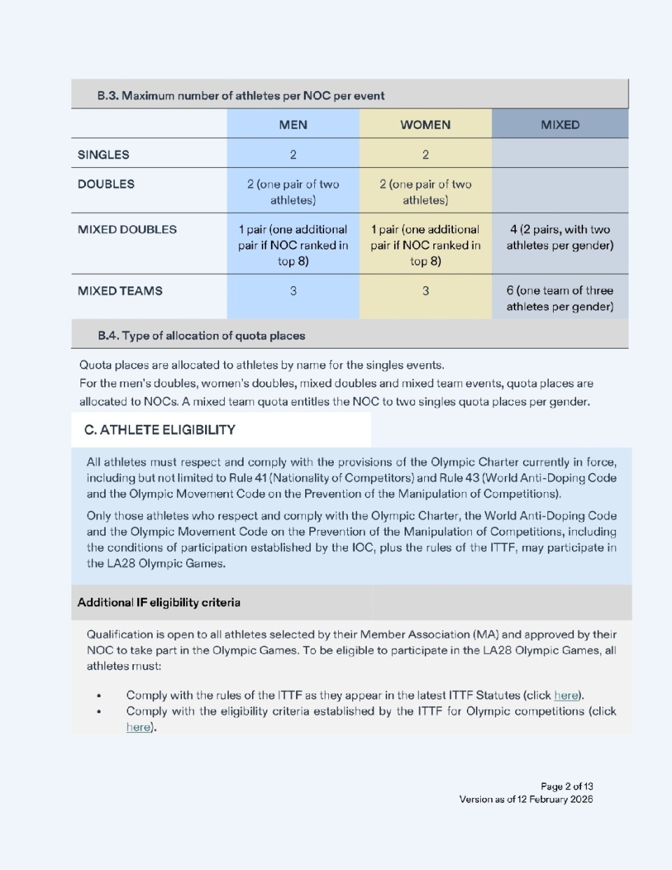 2队:从已获单打或双打或混双满额席位的奥委会中选取两队。选取顺序如下:1、至少有3男3女入选;2、至少有3男2女或2男3女入选;3、2男2女入选。同等条件下首先选取单打人数多者,再选团体名额分配周(2028年5月15日)该期排名中单打(男单或女单)世界排名最高者。