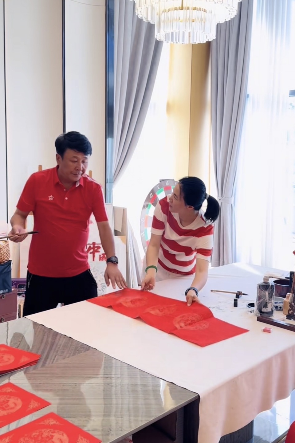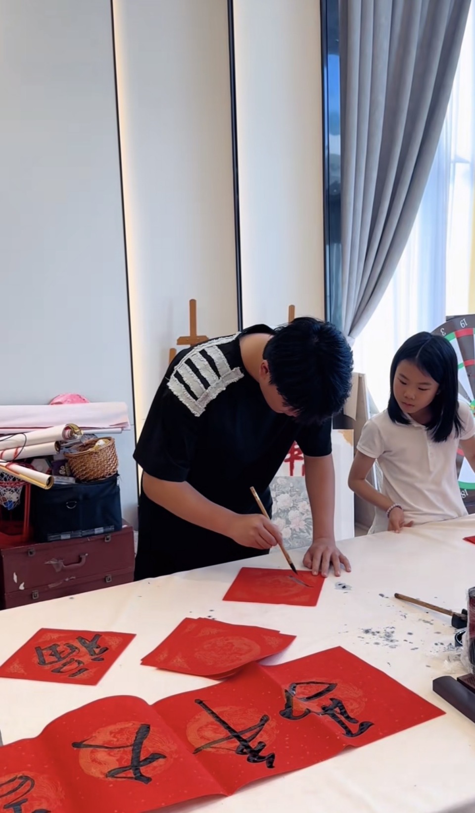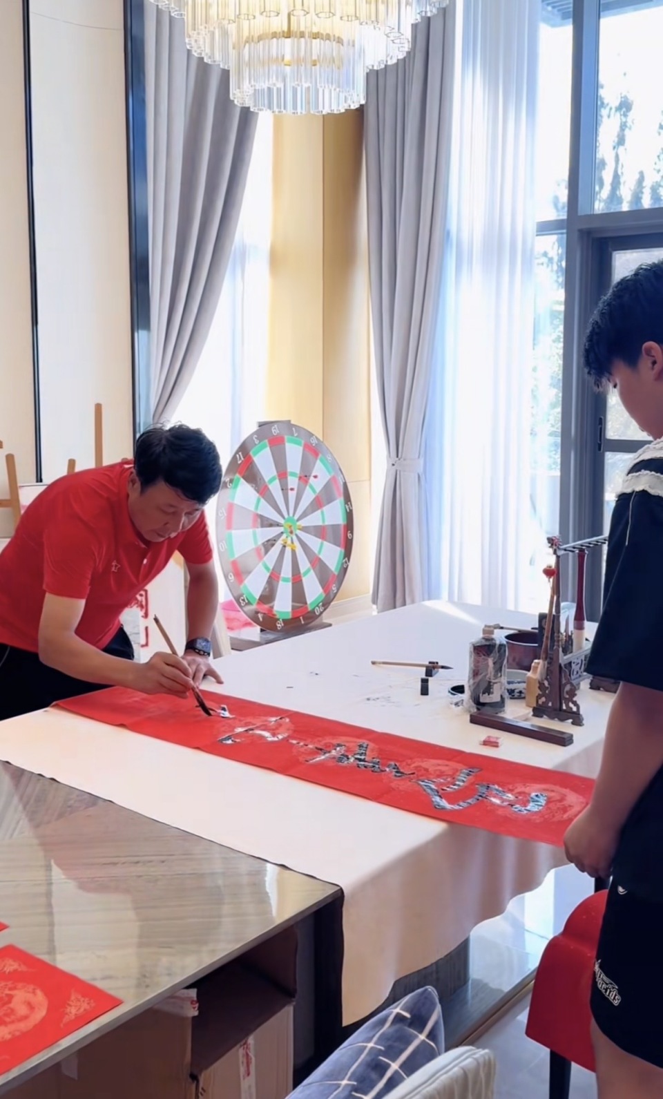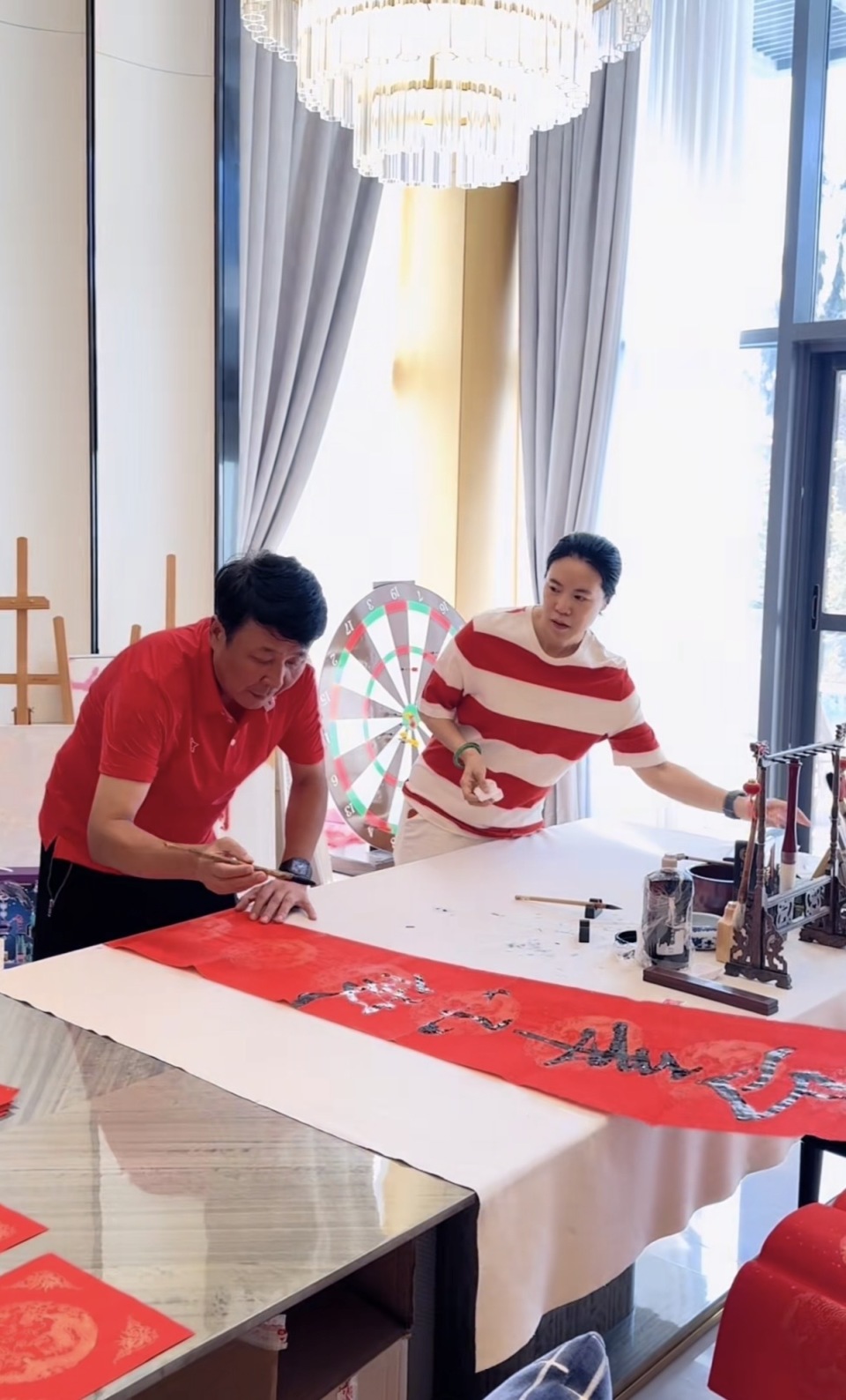 郭斌亲自动手写对联,这模样就像一位艺术家,他和王楠的儿子才15岁,已经知道帮着爸爸向上抽拉对联纸了。