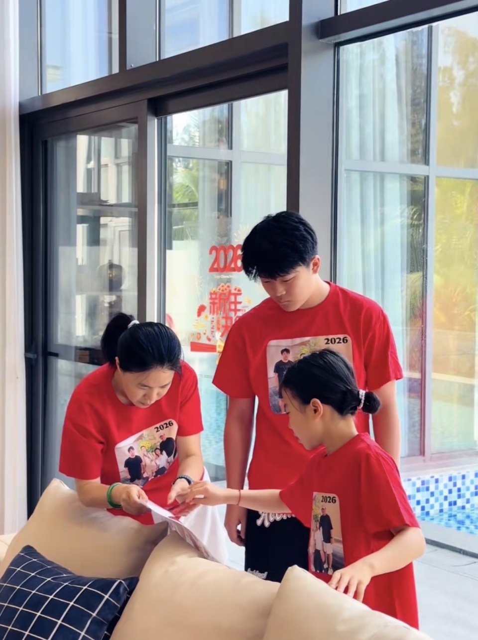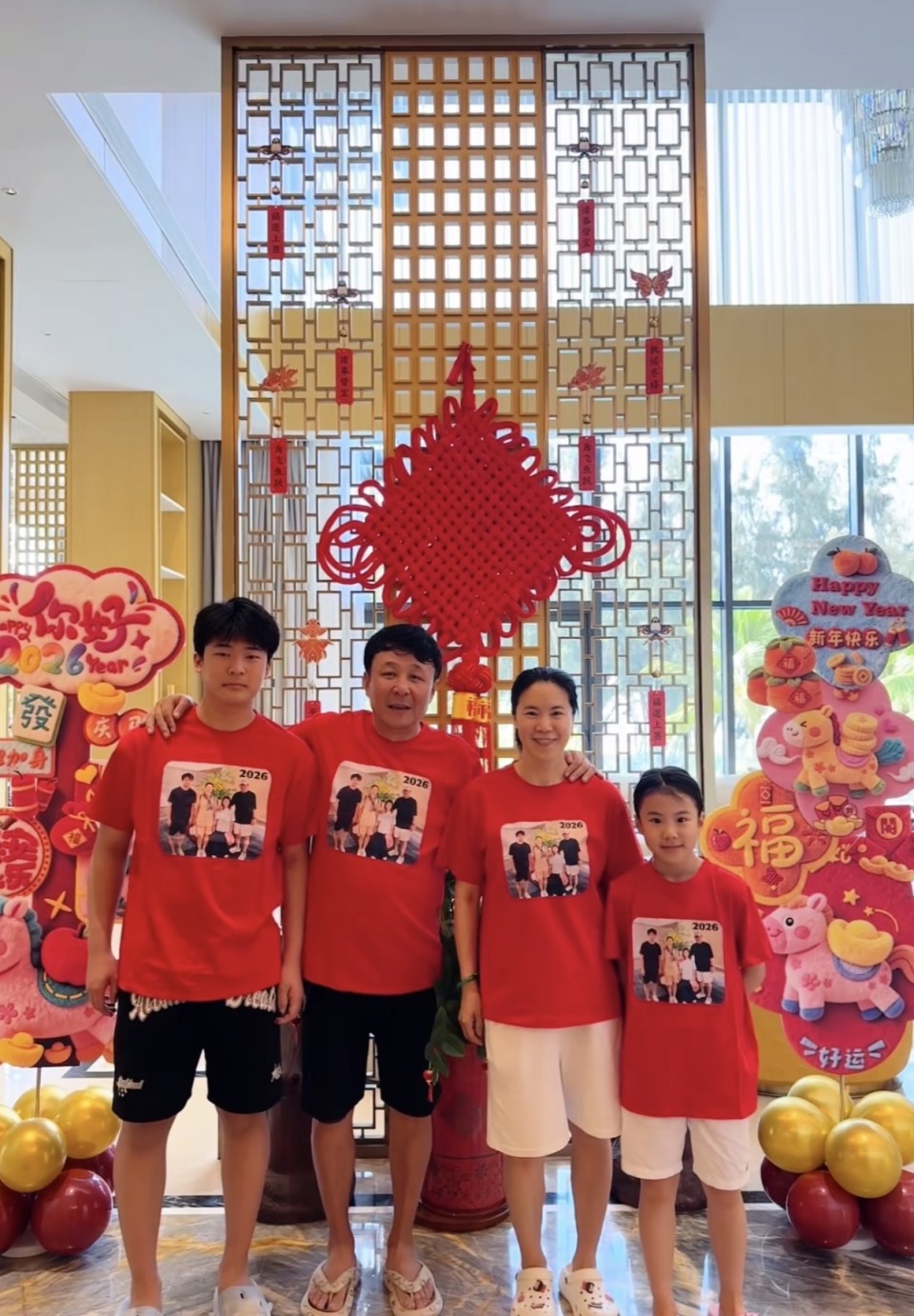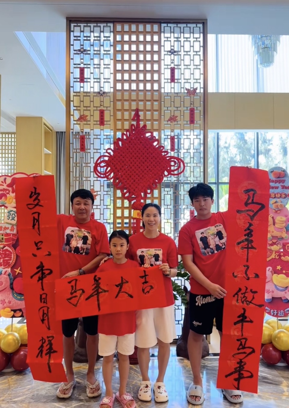 王楠一家三亚过年,郭斌穿红T恤写对联,15岁儿子身高超180!