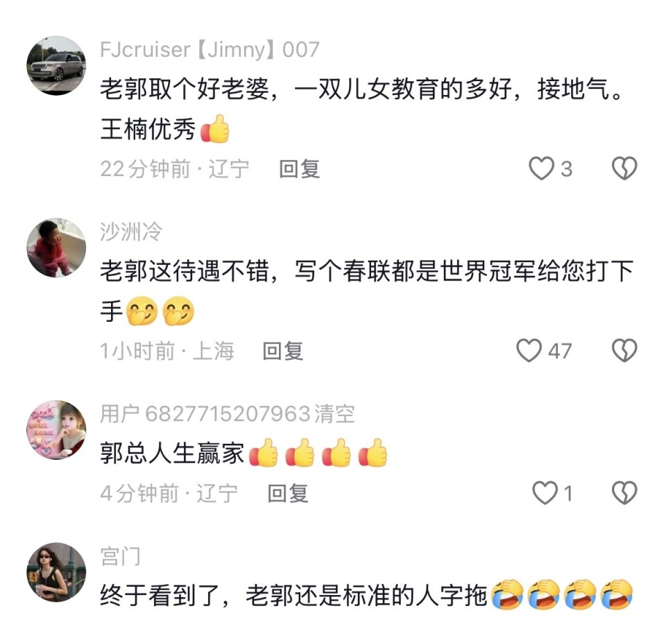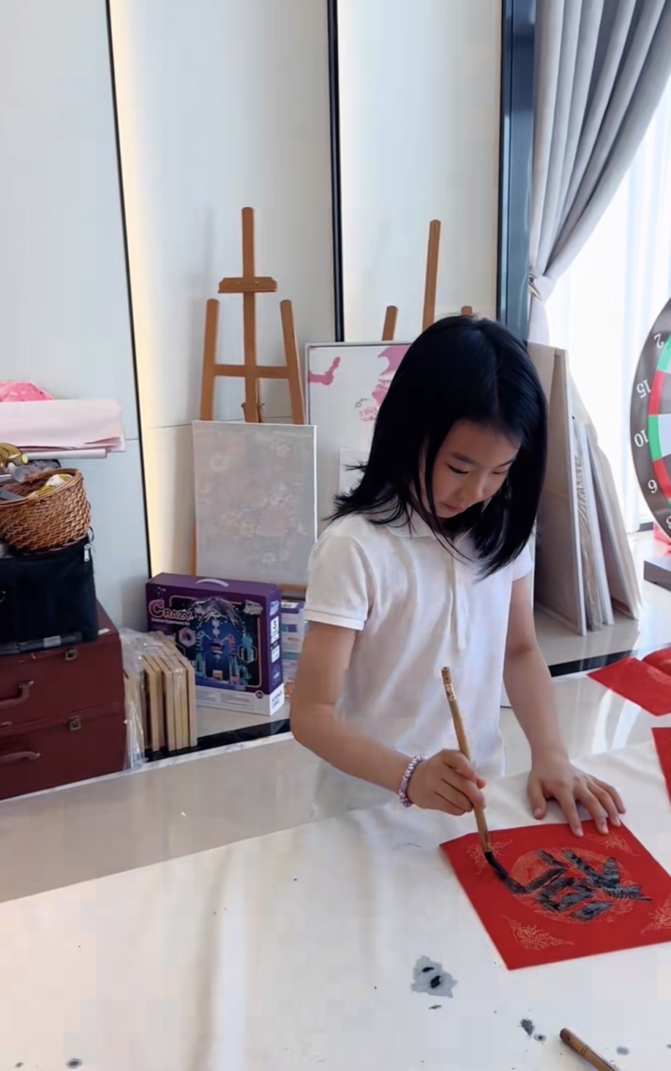 郭斌也是有福气,娶了奥运冠军当老婆,一双儿女都被教育的很好。而且郭总的待遇也不错,写个对联全家人都打下手,这才是真正的人生赢家啊!