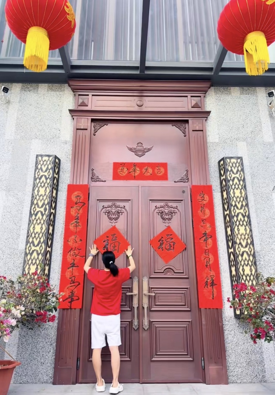 在除夕这天,他们不仅写了对联和福字,一起贴了窗花。从这个角度可以看到王楠一家在三亚住的是独栋别墅,客厅位置的挑高超过5米,非常气派敞亮。